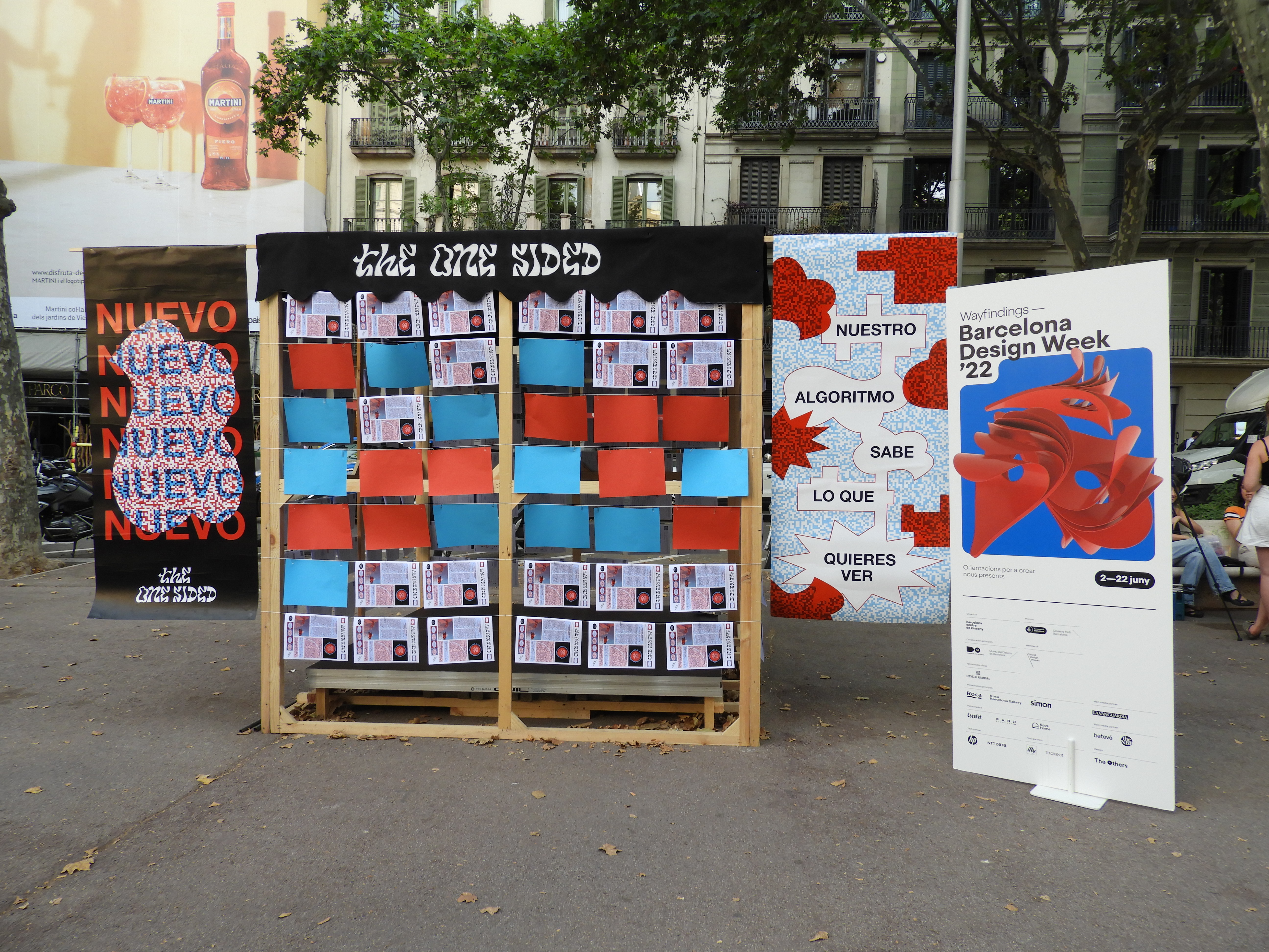THE ONE SIDED project is a newspaper that only shows what its readers want to see. Before purchasing this newspaper, the user is asked a polarizing question. Depending on the answer chosen, the user receives a red or a blue filter. These two filters represent two opposing filter bubbles, and the user will only be able to read one side of the newspaper through the filter.